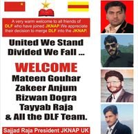 Democratic Liberation Front Jammu Kashmir was a party formed by some true Nationalist and Patriotic Political Workers of Jammu Kashmir. Over the previous month or so We held detailed negotiations with their leadership and they finally agreed to merge their party into the JKNAP. I congratulate all workers of JKNAP at this National achievement and hope that this merger will strengthen our National movement and the National State Narrative shall now be projected with further force. I take this opportunity to specially thank Zakeer Anjum, Raja Attique Zahid, Mateen Gohir, Rizwan Dogra,Tayyab Raja, Nighat Parveen, Raheela Iqbal and Aamir Khan from former DLF JK and Adeel Magray, Abdul Latif and Sameena Raja from JKNAP for their support and contribution to facilitate this process to reach this very important political milestone.